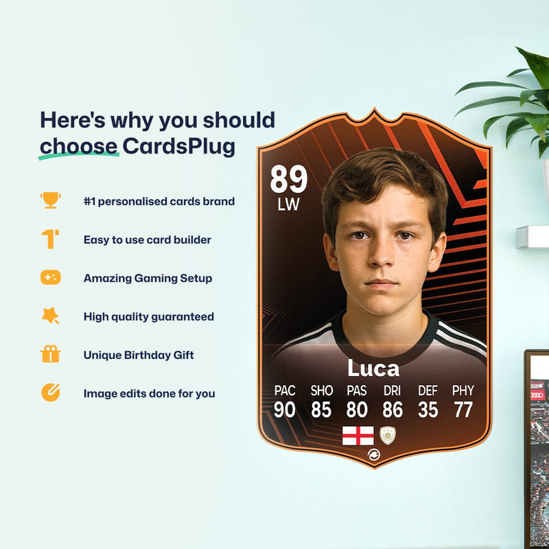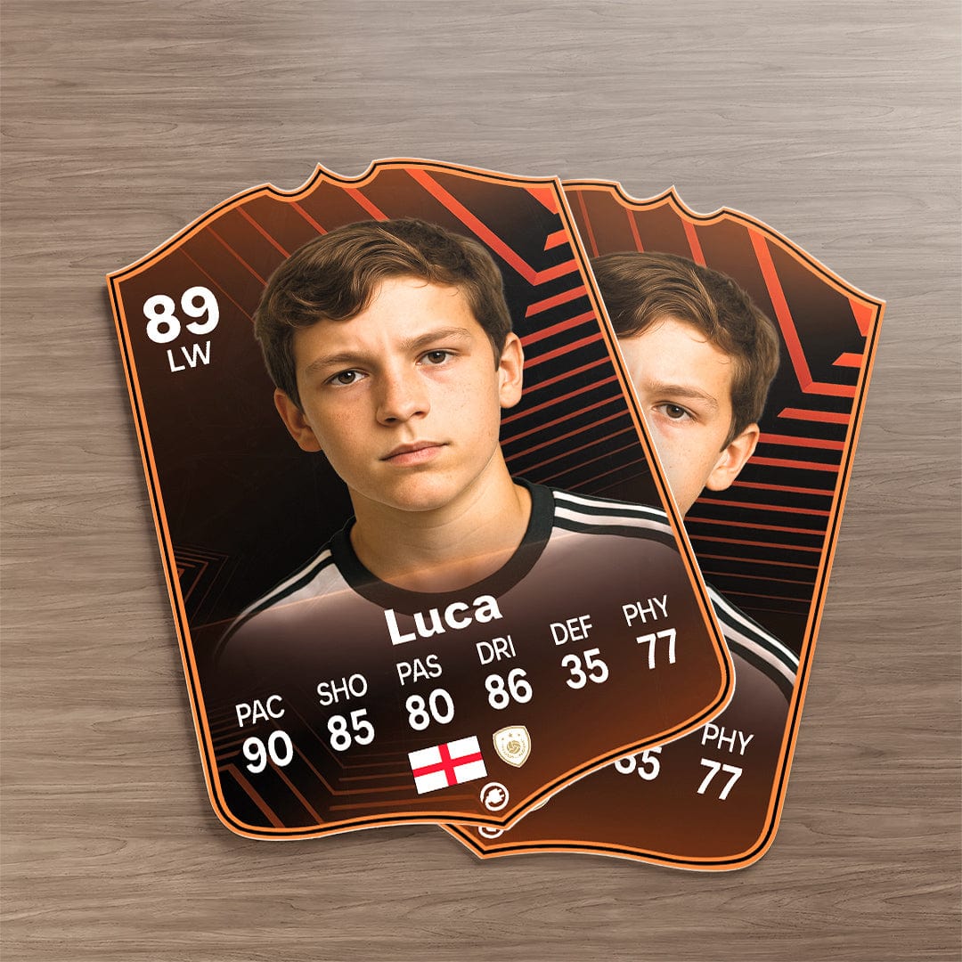 CardsPlug is home to the world’s favourite personalised football cards. Our easy football card builder lets you make a real life football card with your own name, photo, and skill ratings. With 100+ designs to choose from and some inspired by EA SPORTS FC 26 cards seen in EA FC 26, EA FC 25 and FC 24 as well as FIFA cards seen in games like FIFA 23 and FIFA 22.