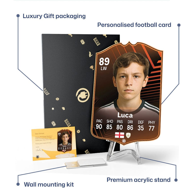 When it comes to personalising your card, the basic steps are to upload a photo and add a name to your card. Then you’ll add details like your player’s position and skill ratings out of 99 for each football skill shown on the card. Our online card builder makes this really easy. And if you aren’t a football card expert, don’t worry!