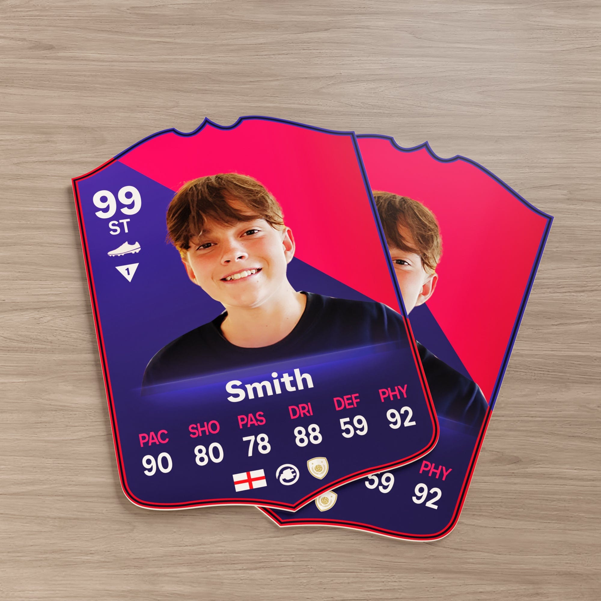 Our football card builder lets you choose between two different card materials. Our Standard cards are made of a ultra-strong variety of Foamex (not cardboard or foam!). This material has a lovely gloss finish and is also super durable. Our world-exclusive Metal football cards have a matte finish and are slightly heavier. Both look amazing and will last forever.