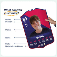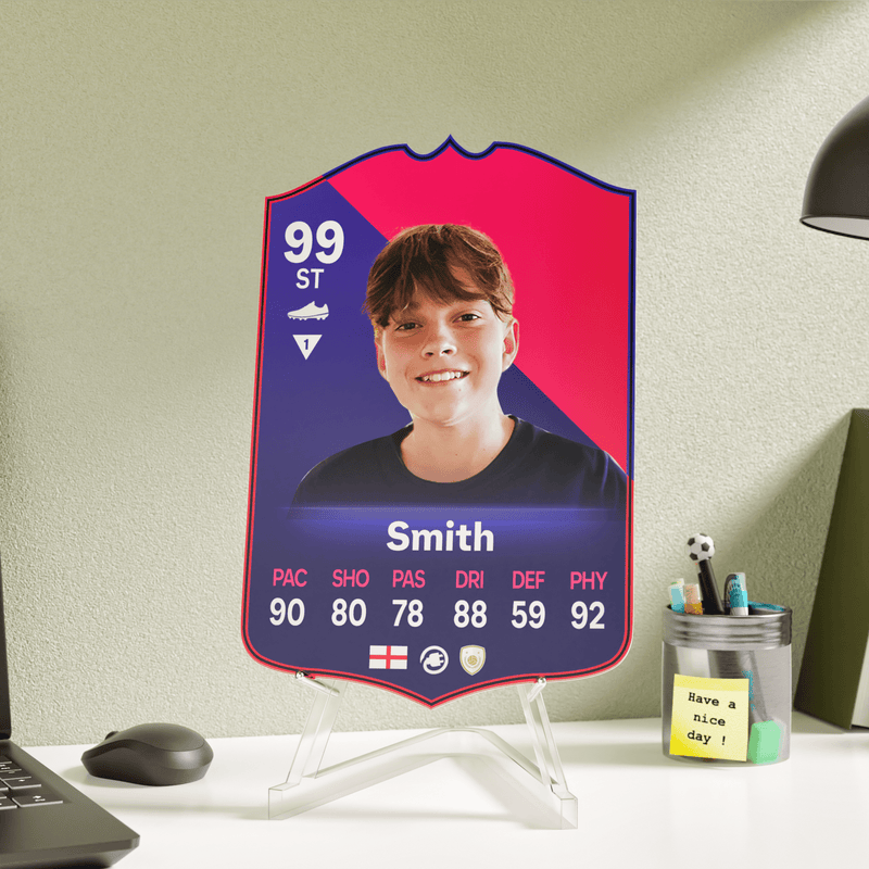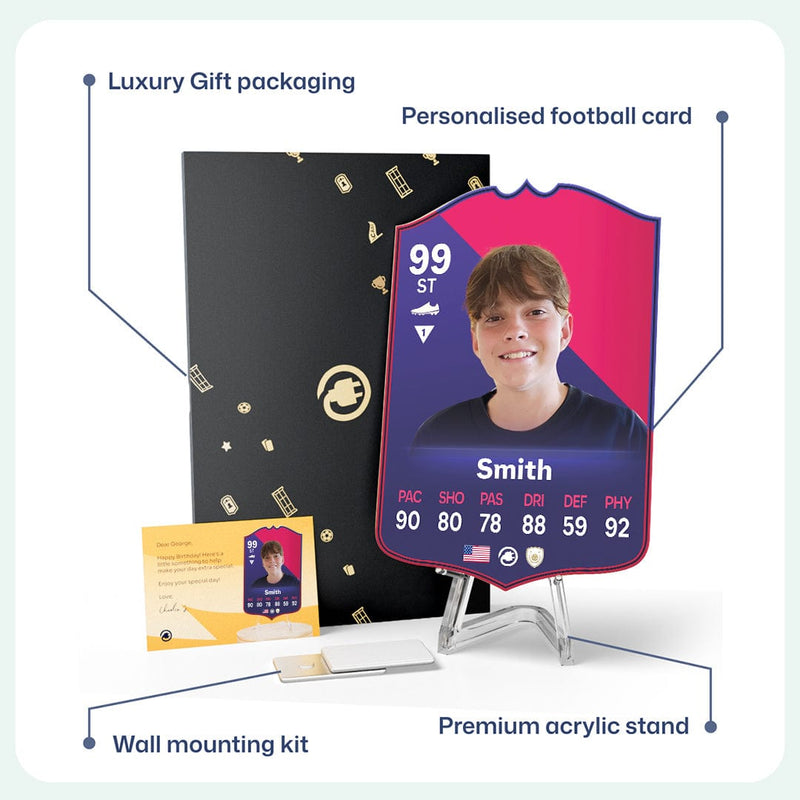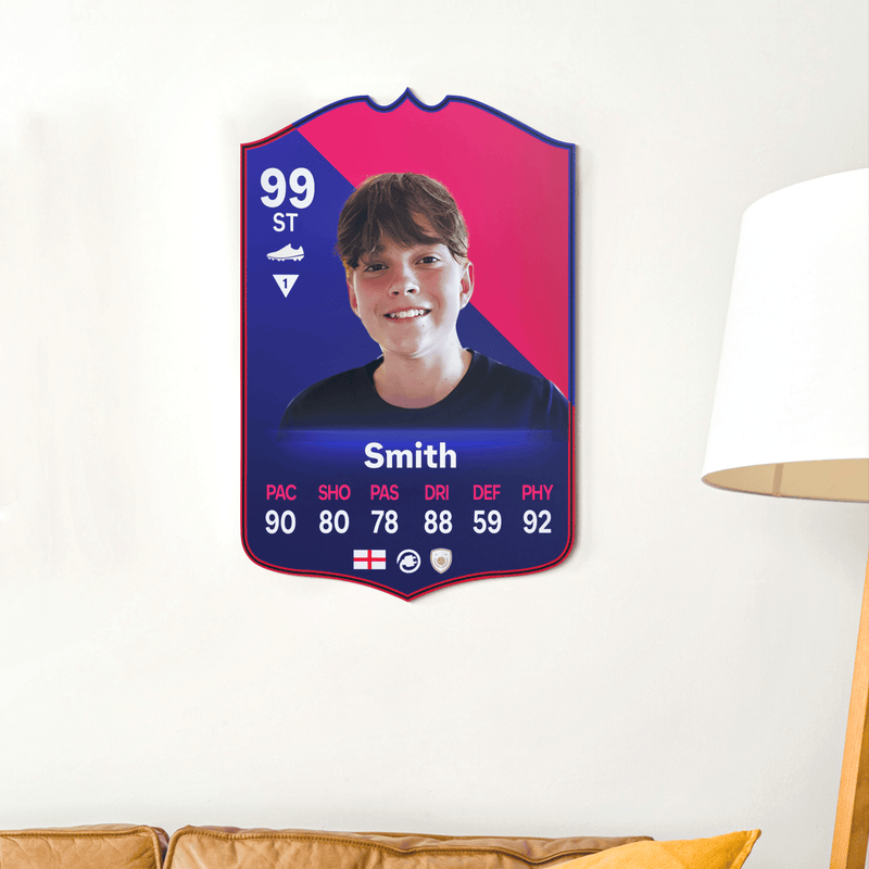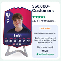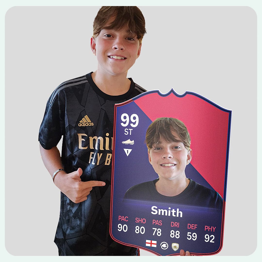When it comes to personalising your card, the basic steps are to upload a photo and add a name to your card. Then you’ll add details like your player’s position and skill ratings out of 99 for each football skill shown on the card. Our online card builder makes this really easy. And if you aren’t a football card expert, don’t worry!
