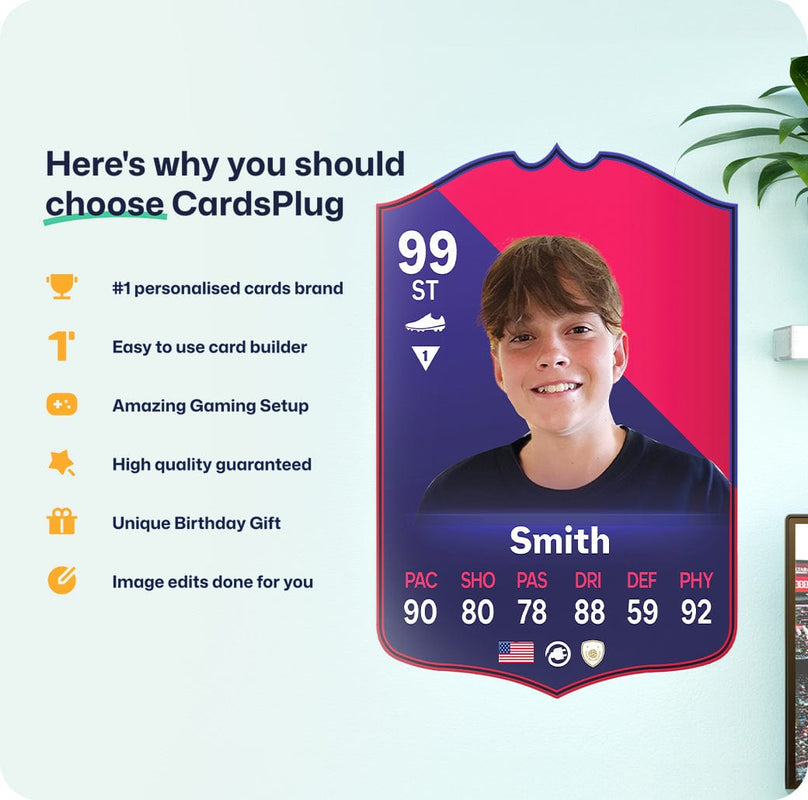 CardsPlug is home to the world’s favourite personalised football cards. Our easy football card builder lets you make a real life football card with your own name, photo, and skill ratings. With 100+ designs to choose from and some inspired by EA SPORTS FC 26 cards seen in EA FC 26, EA FC 25 and FC 24 as well as FIFA cards seen in games like FIFA 23 and FIFA 22.