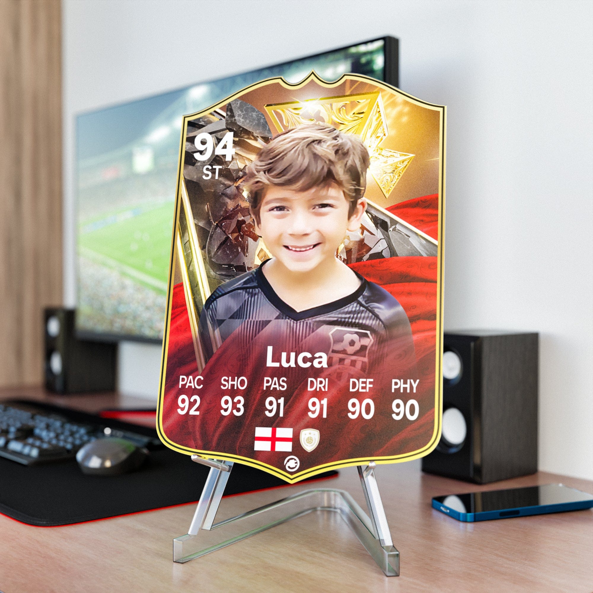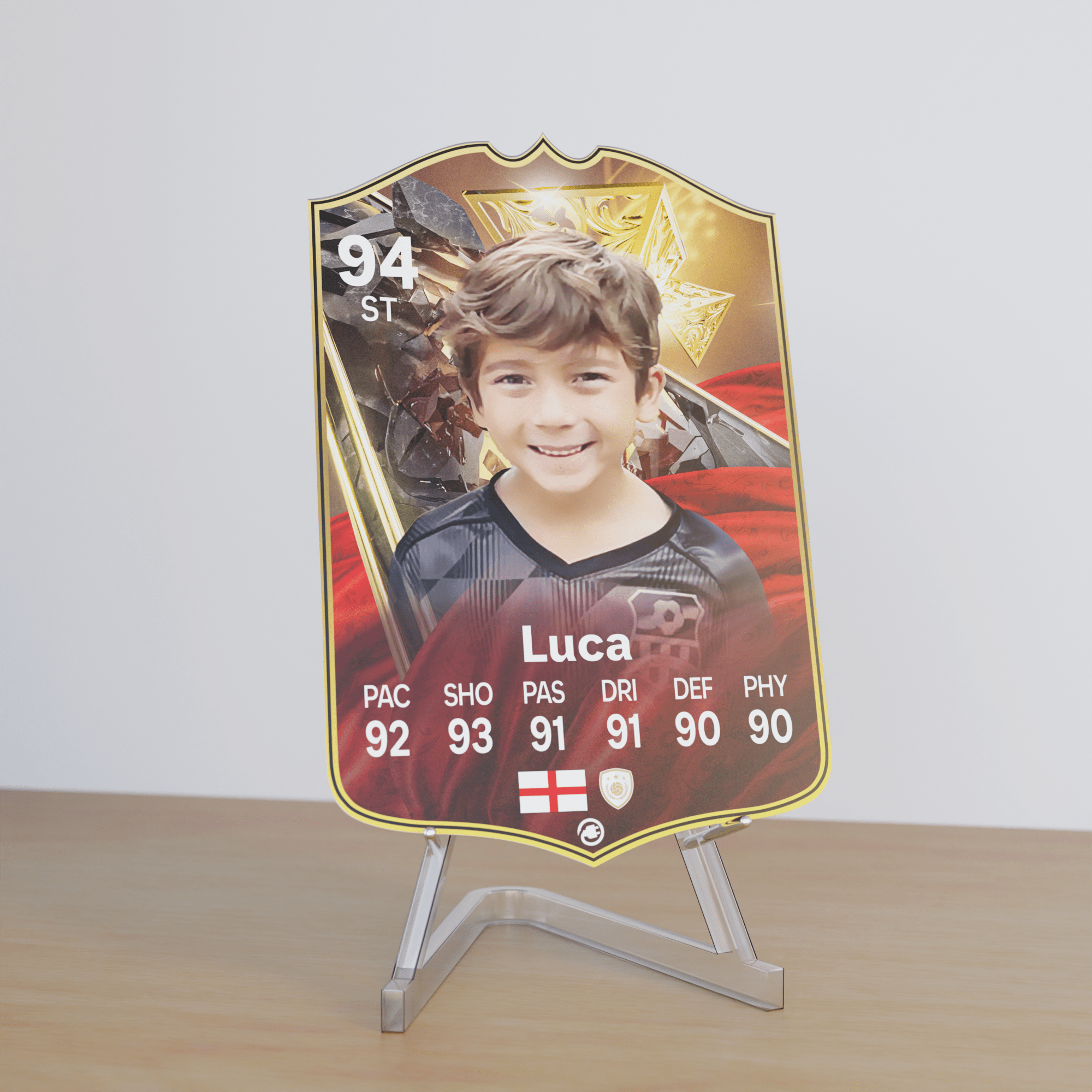 When it comes to personalising your card, the basic steps are to upload a photo and add a name to your card. Then you’ll add details like your player’s position and skill ratings out of 99 for each football skill shown on the card. Our online card builder makes this really easy. And if you aren’t a football card expert, don’t worry!