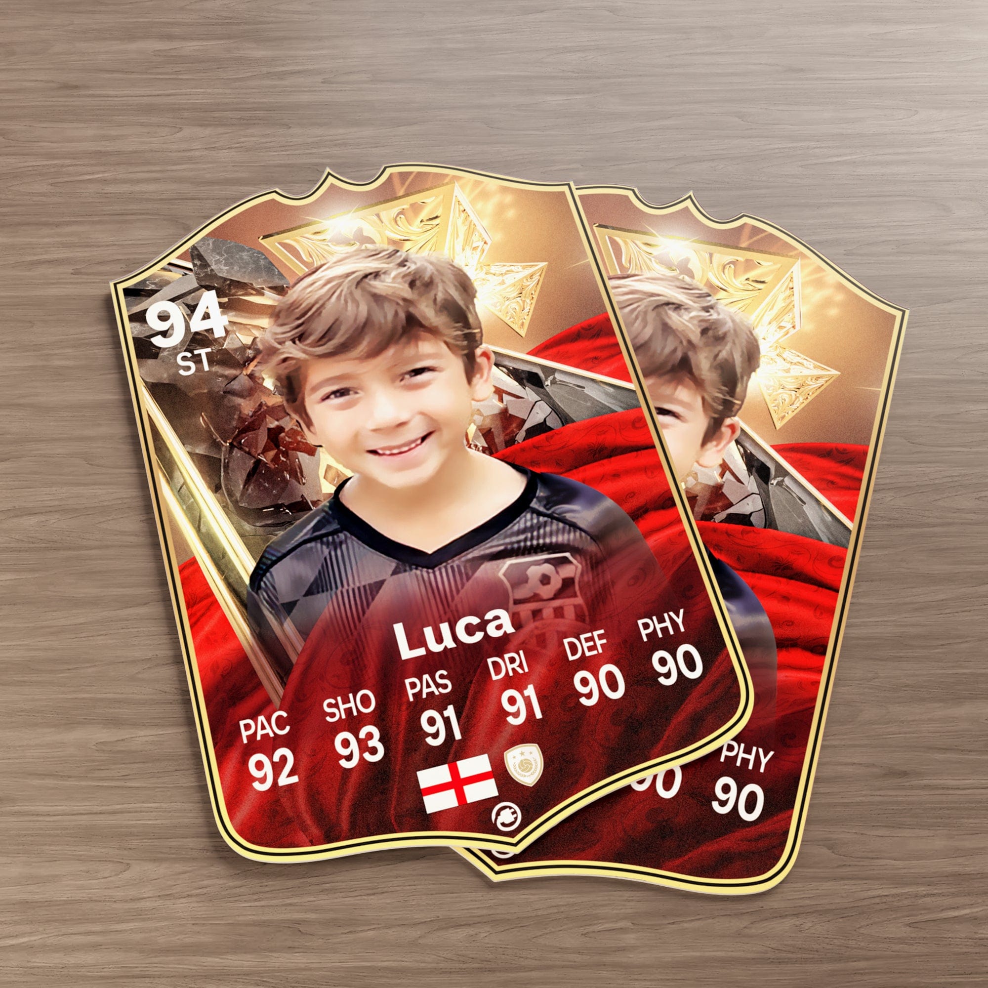 Our football card builder lets you choose between two different card materials. Our Standard cards are made of a ultra-strong variety of Foamex (not cardboard or foam!). This material has a lovely gloss finish and is also super durable. Our world-exclusive Metal football cards have a matte finish and are slightly heavier. Both look amazing and will last forever.