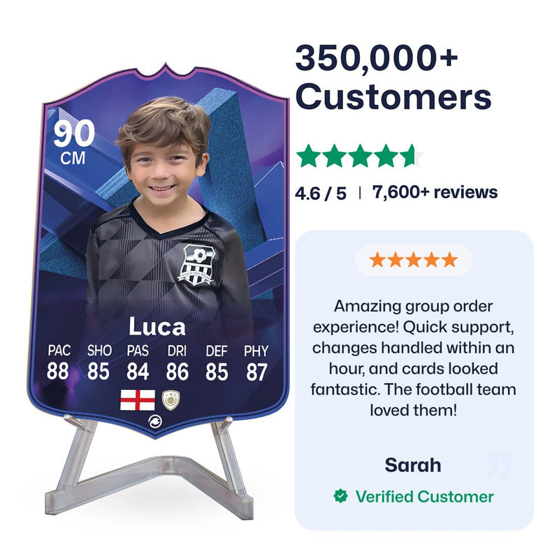 Once you’ve personalised your card, our design experts will edit your photo, design your card, and bring it to life in stunning quality. You’ll get a full preview before we print your card and every card’s quality is backed by our Gold Standard Guarantee. So far, over 350,000+ football fans agree: A CardsPlug football card is the ultimate football gift!