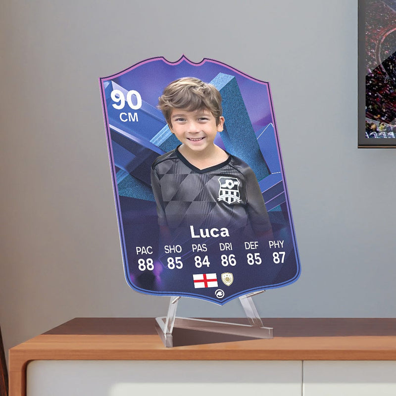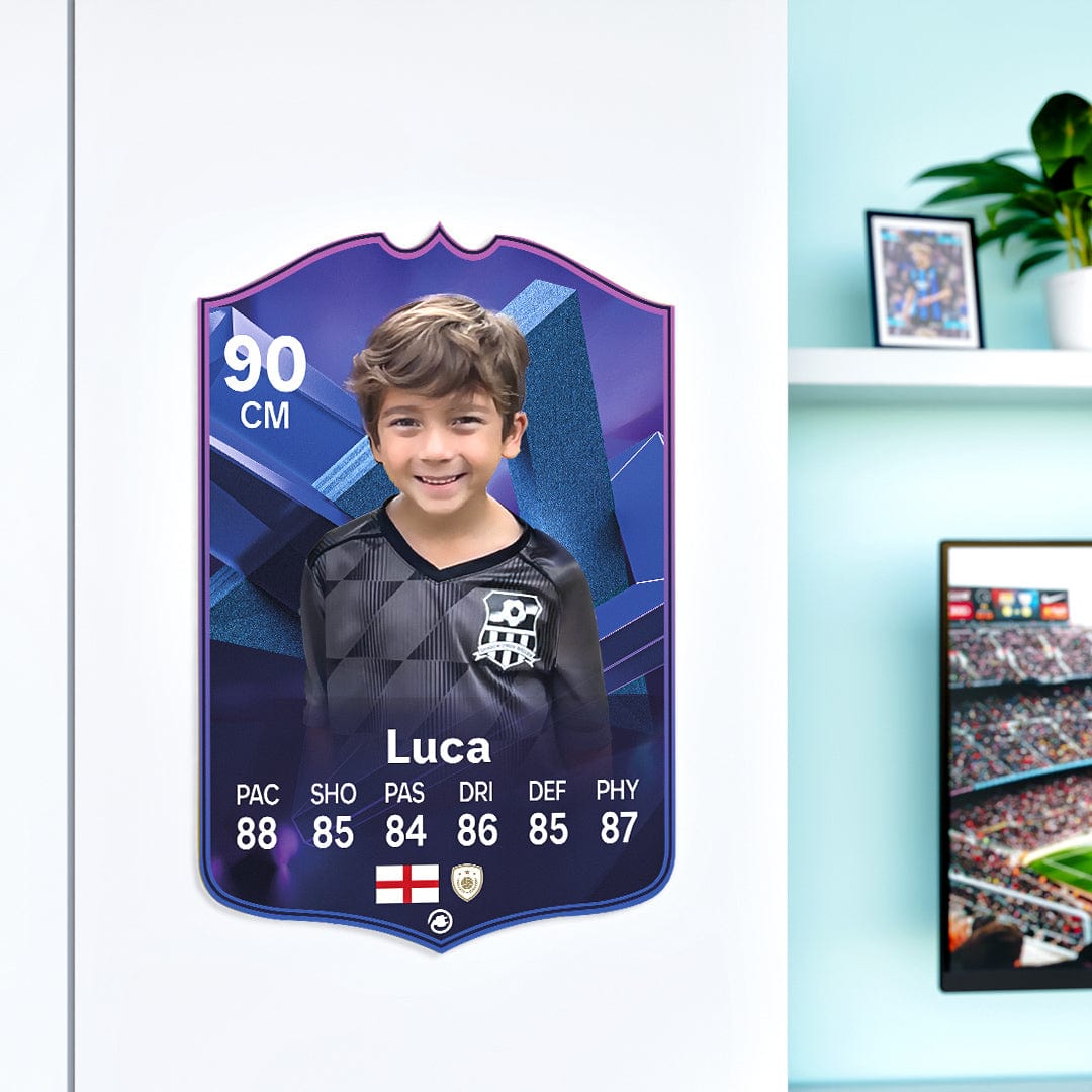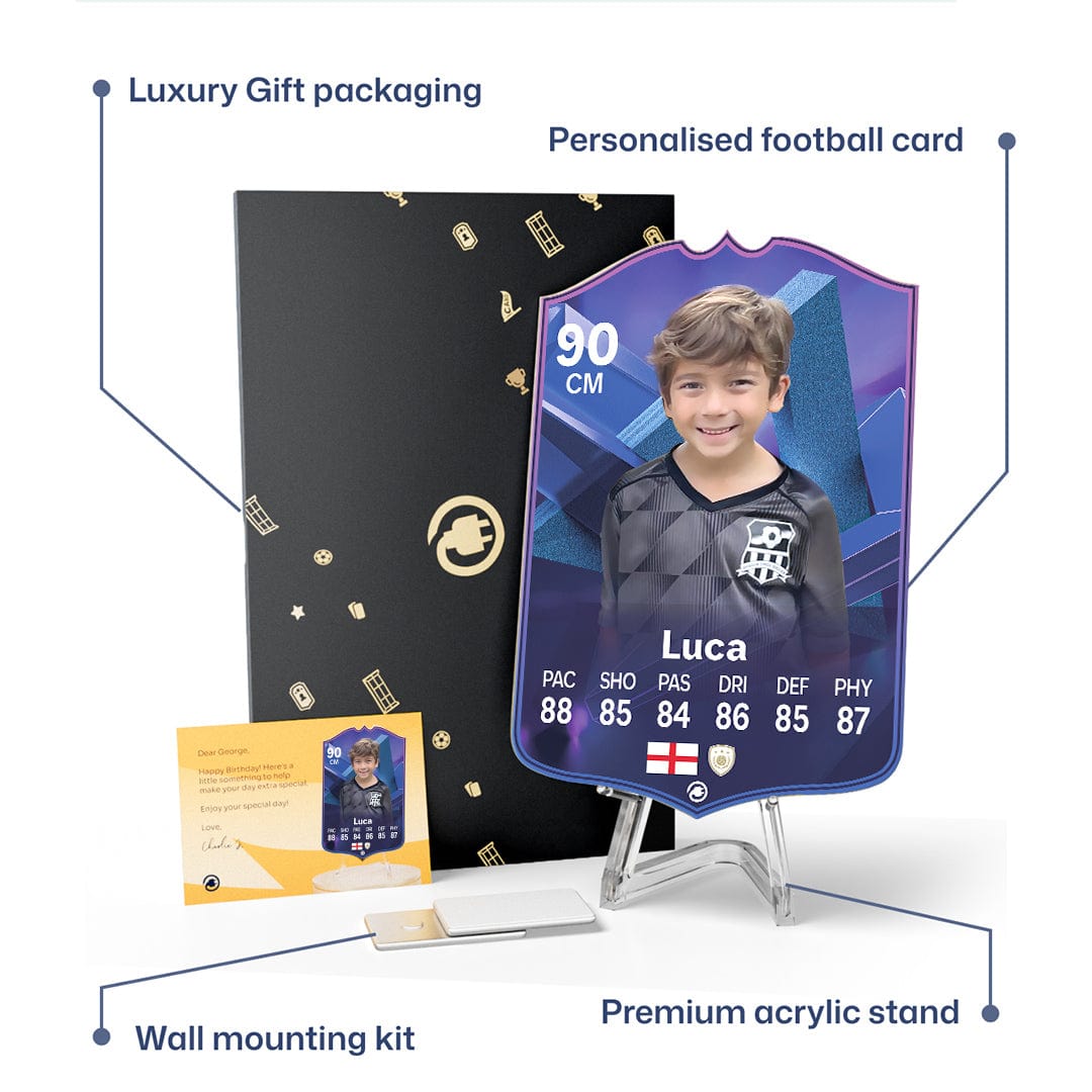 When it comes to personalising your card, the basic steps are to upload a photo and add a name to your card. Then you’ll add details like your player’s position and skill ratings out of 99 for each football skill shown on the card. Our online card builder makes this really easy. And if you aren’t a football card expert, don’t worry!