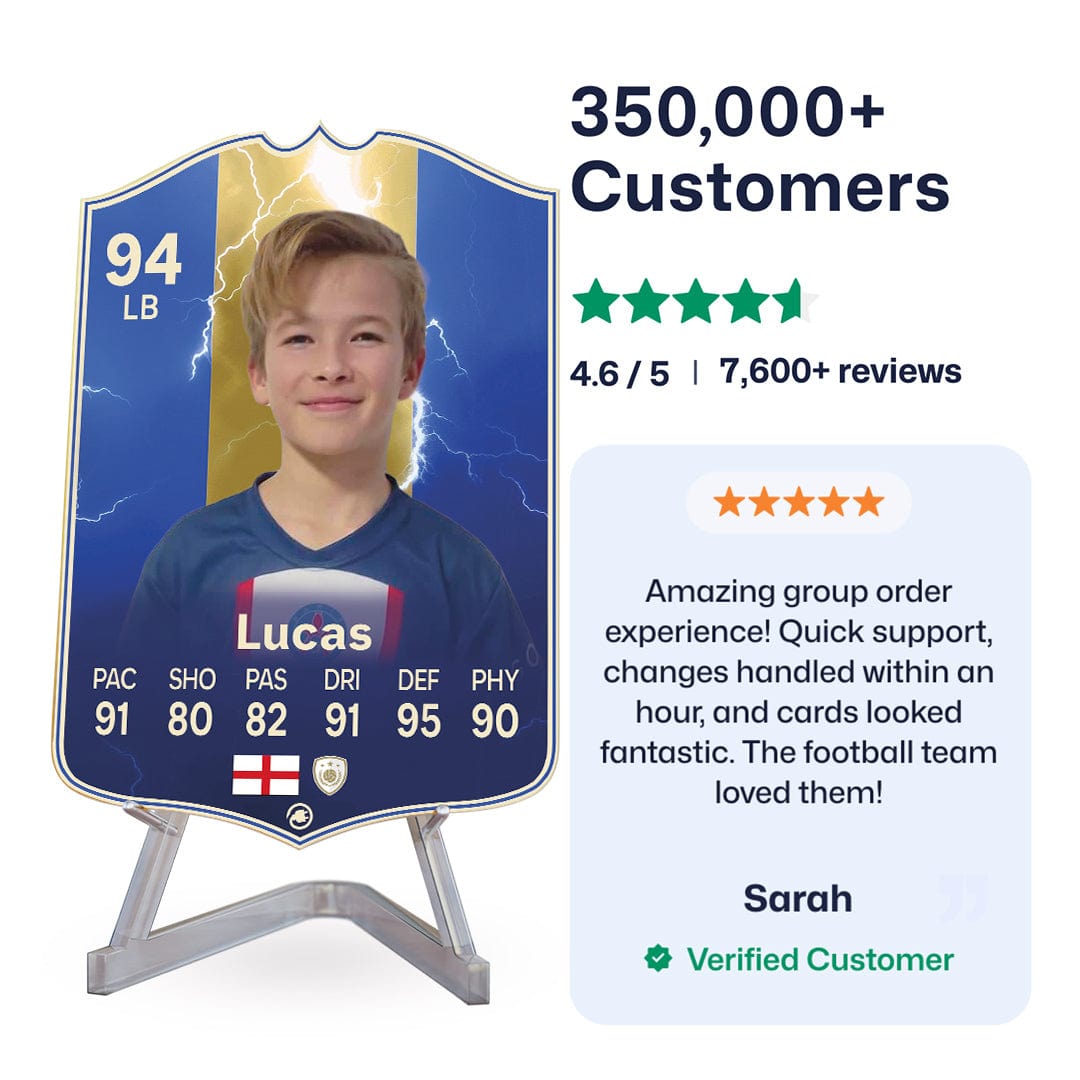 Once you’ve personalised your card, our design experts will edit your photo, design your card, and bring it to life in stunning quality. You’ll get a full preview before we print your card and every card’s quality is backed by our Gold Standard Guarantee. So far, over 350,000+ football fans agree: A CardsPlug football card is the ultimate football gift!
