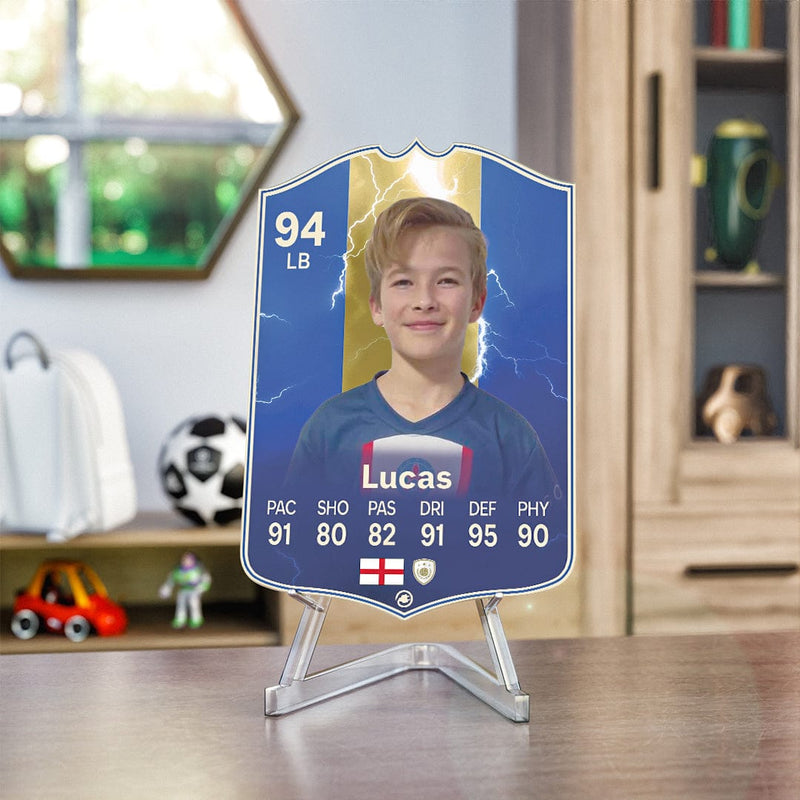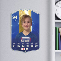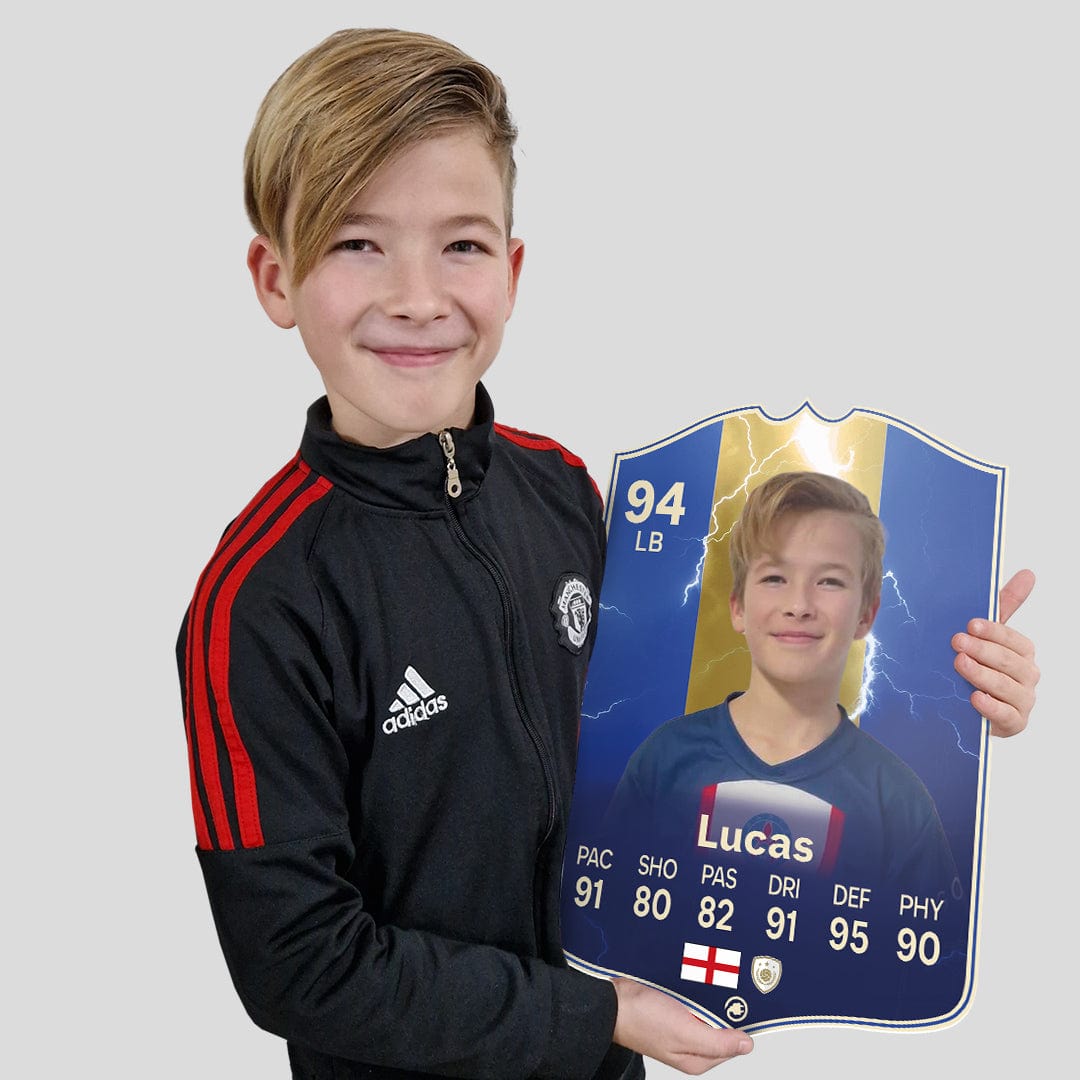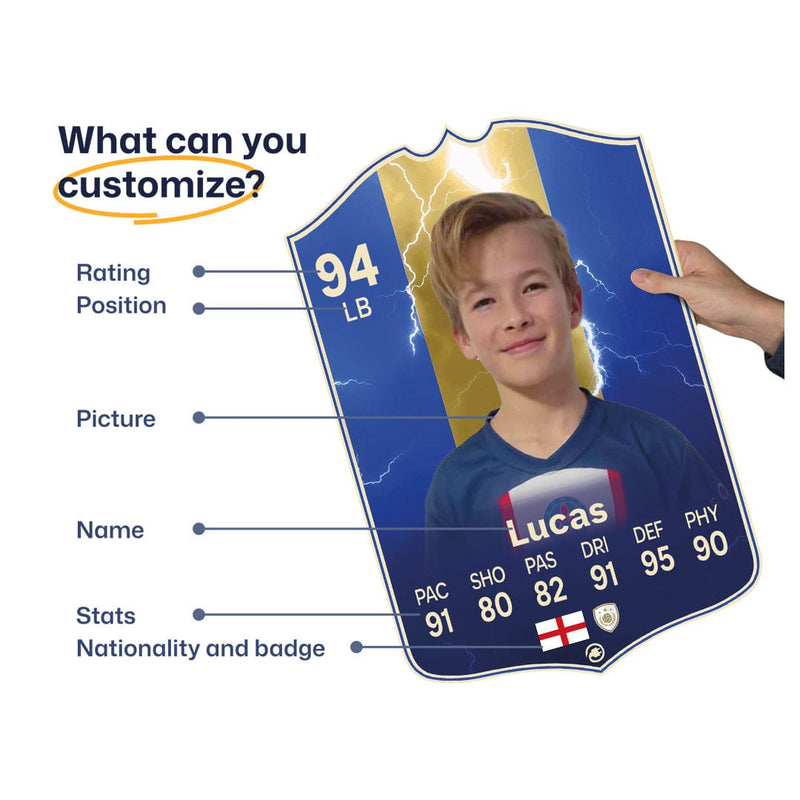 When it comes to personalising your card, the basic steps are to upload a photo and add a name to your card. Then you’ll add details like your player’s position and skill ratings out of 99 for each football skill shown on the card. Our online card builder makes this really easy. And if you aren’t a football card expert, don’t worry!