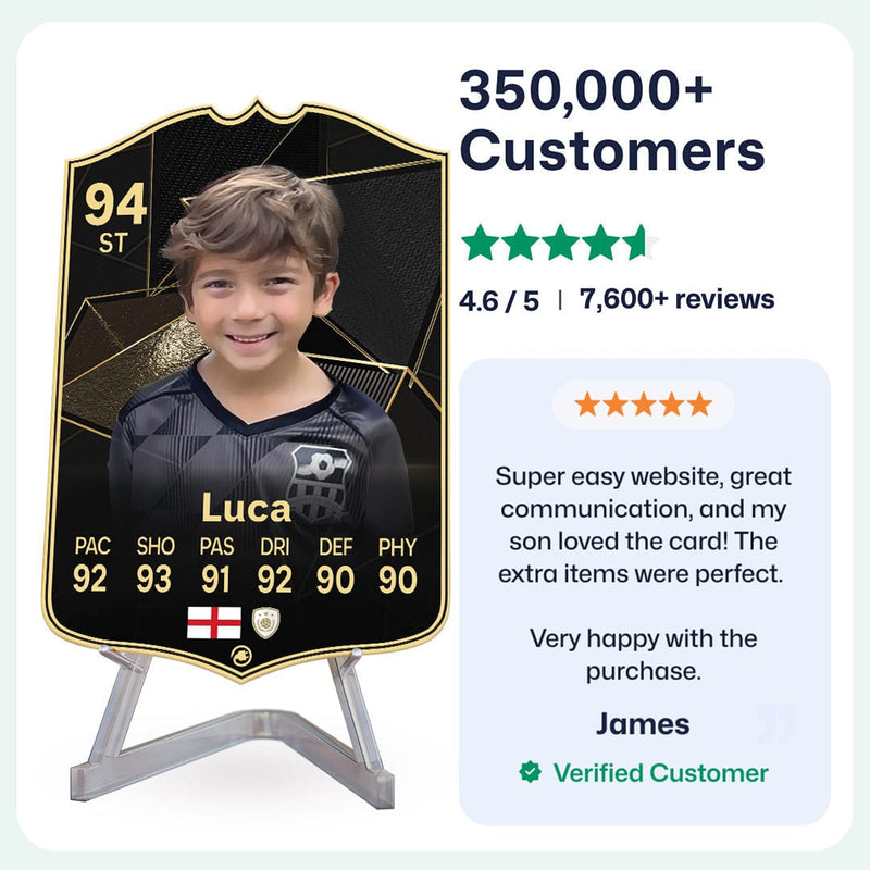 Yes! Our football card designers will remove the background from the photo you upload so it looks just like the football cards you might’ve seen games like EA FC 25, EA FC 24 or FIFA. We’ll also position the photo perfectly on the football card so it looks great. If there are any problems with the quality of your photo, we’ll reach out and let you know. Plus, our website's AI will remove the background on the image for visual purposes before purchase so you can see it without a background on the card.