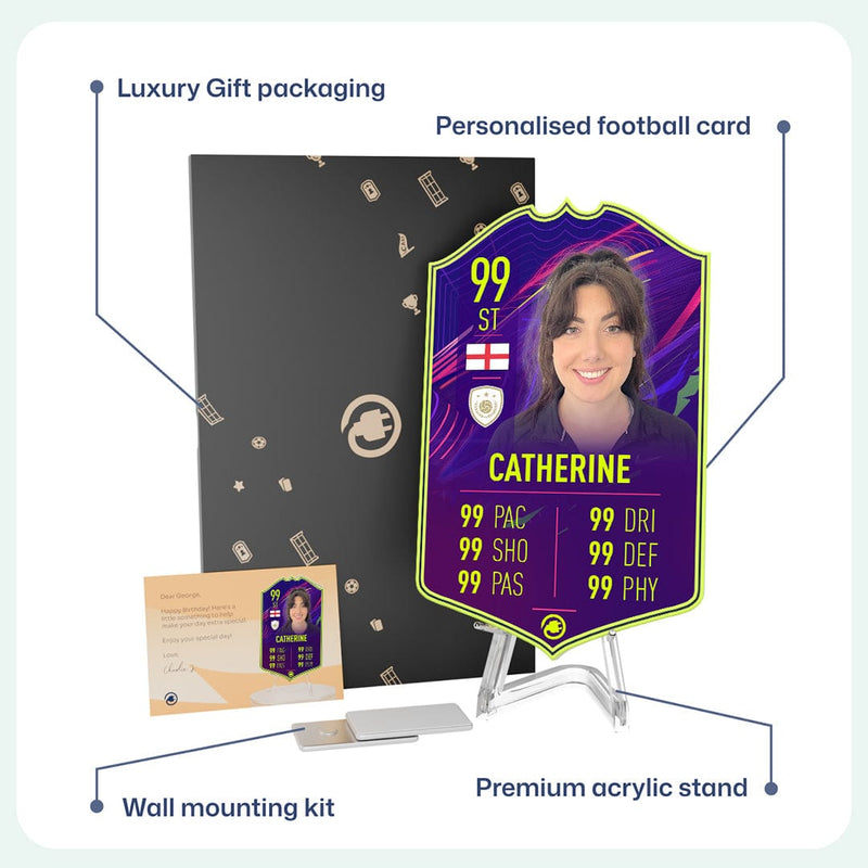 When it comes to personalising your card, the basic steps are to upload a photo and add a name to your card. Then you’ll add details like your player’s position and skill ratings out of 99 for each football skill shown on the card. Our online card builder makes this really easy. And if you aren’t a football card expert, don’t worry!