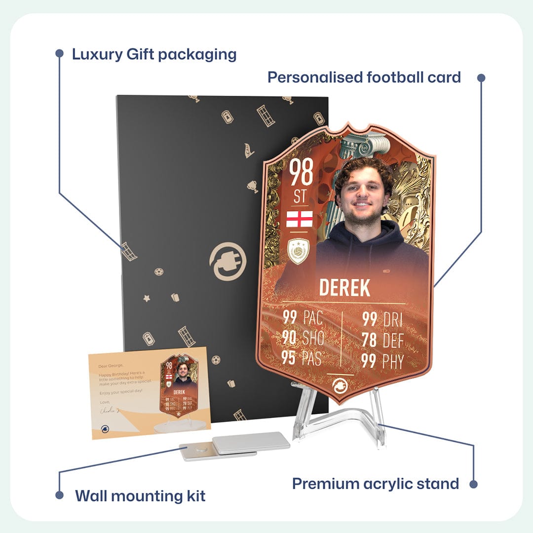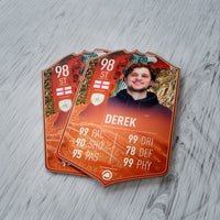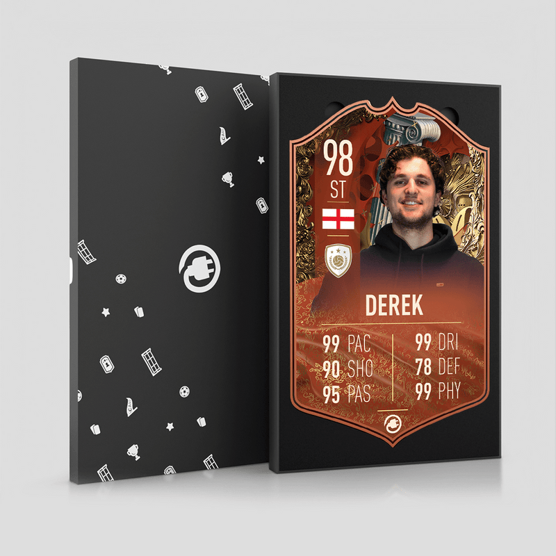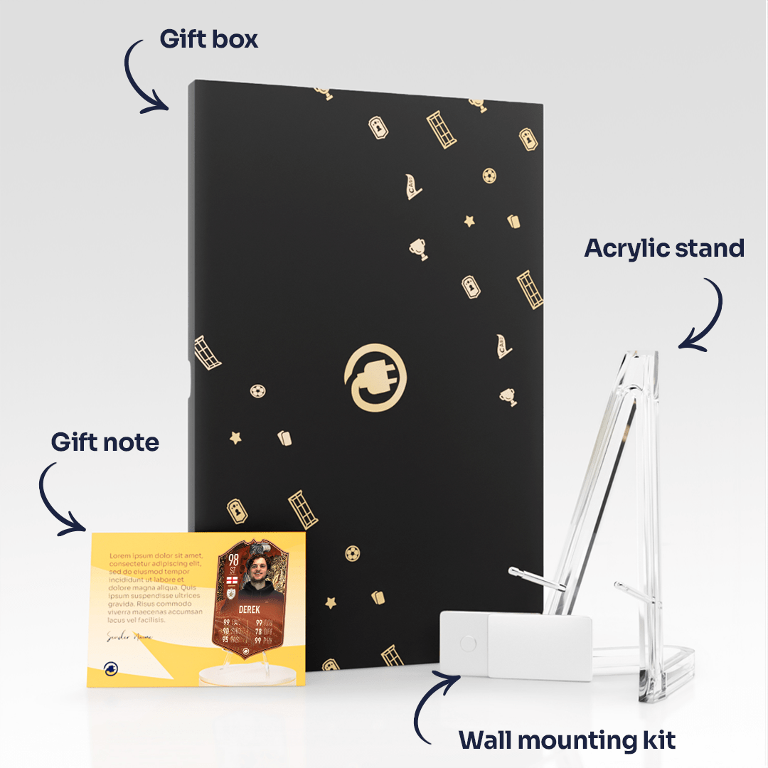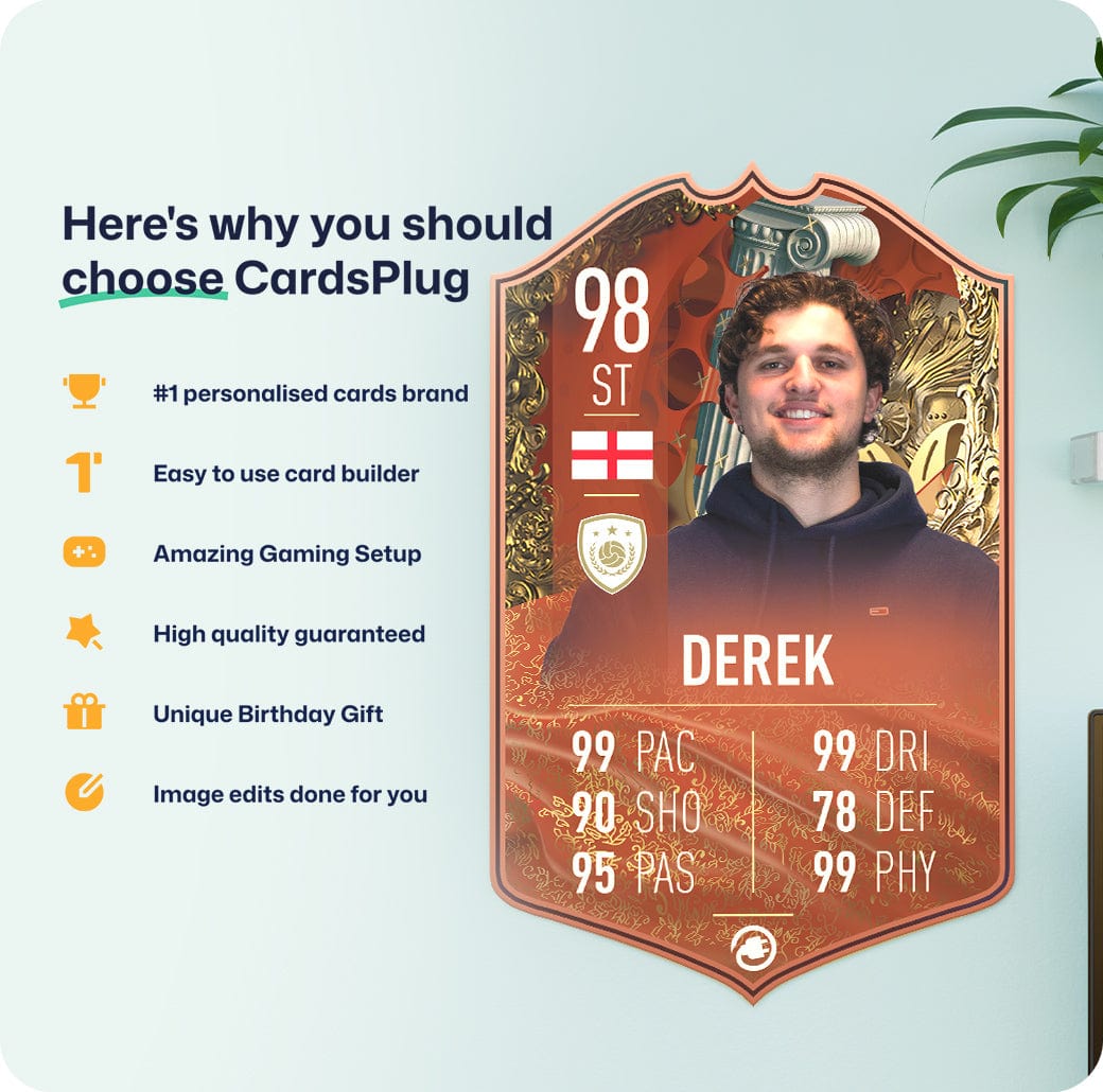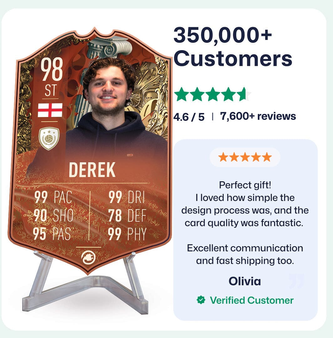 CardsPlug is home to the world’s favourite personalised football cards. Our easy football card builder lets you make a real life football card with your own name, photo, and skill ratings. With 100+ designs to choose from and some inspired by EA SPORTS FC 26 cards seen in EA FC 26, EA FC 25 and FC 24 as well as FIFA cards seen in games like FIFA 23 and FIFA 22.