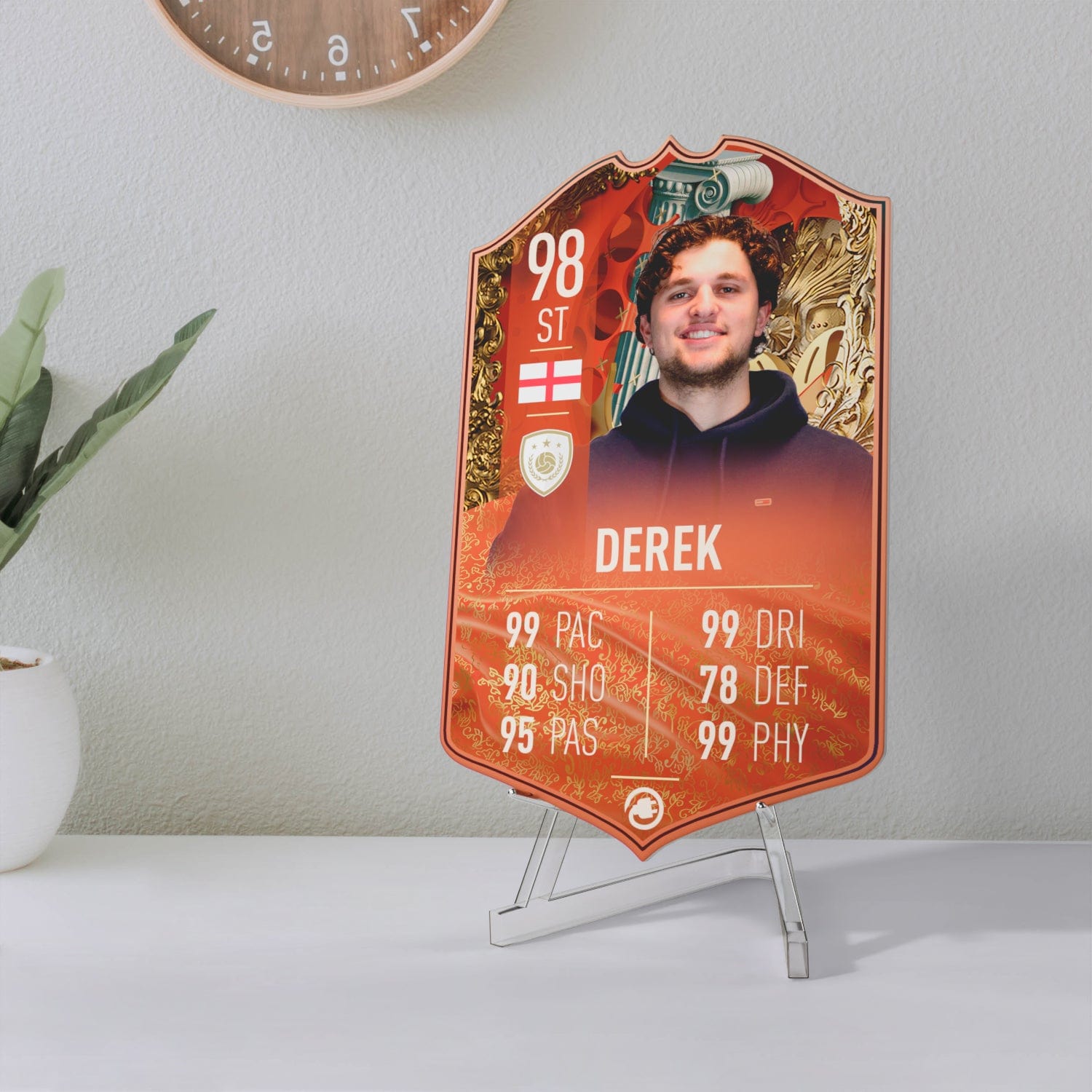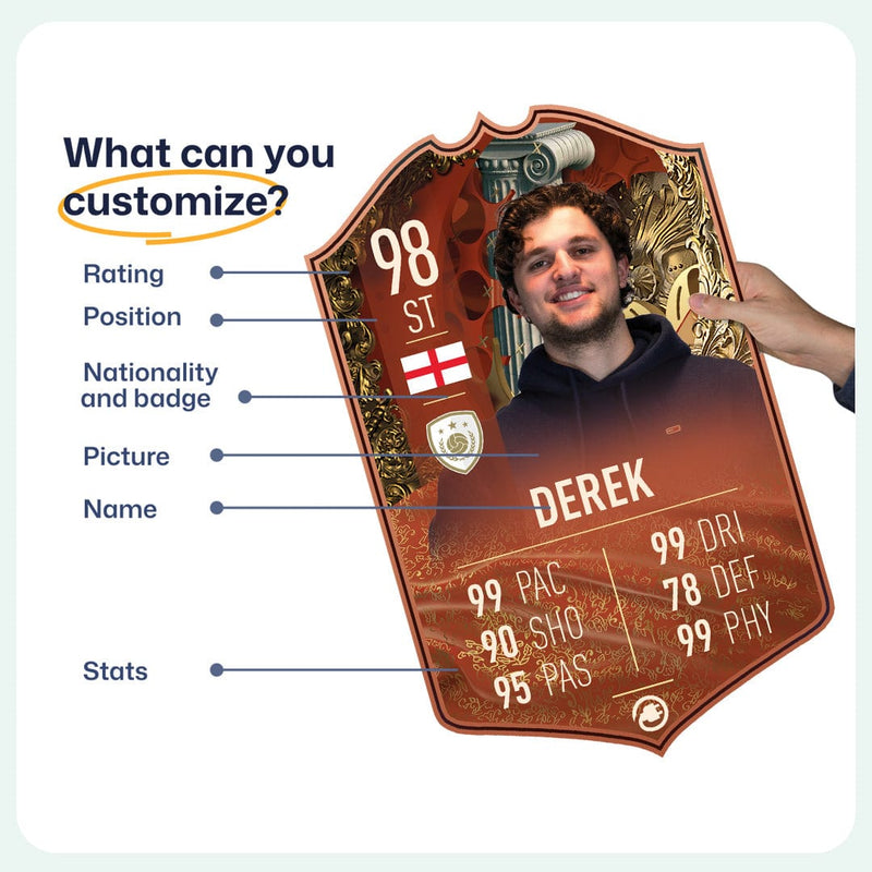 When it comes to personalising your card, the basic steps are to upload a photo and add a name to your card. Then you’ll add details like your player’s position and skill ratings out of 99 for each football skill shown on the card. Our online card builder makes this really easy. And if you aren’t a football card expert, don’t worry!