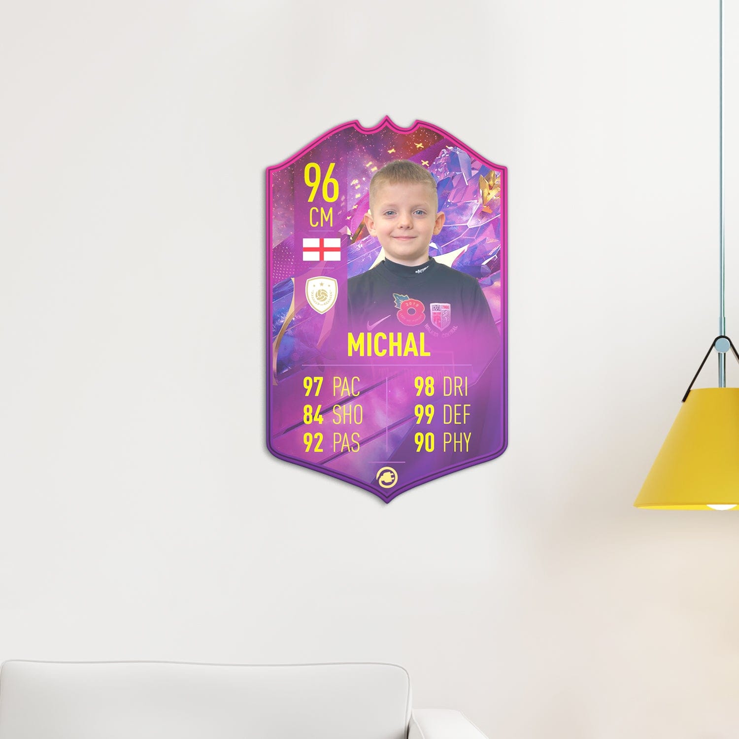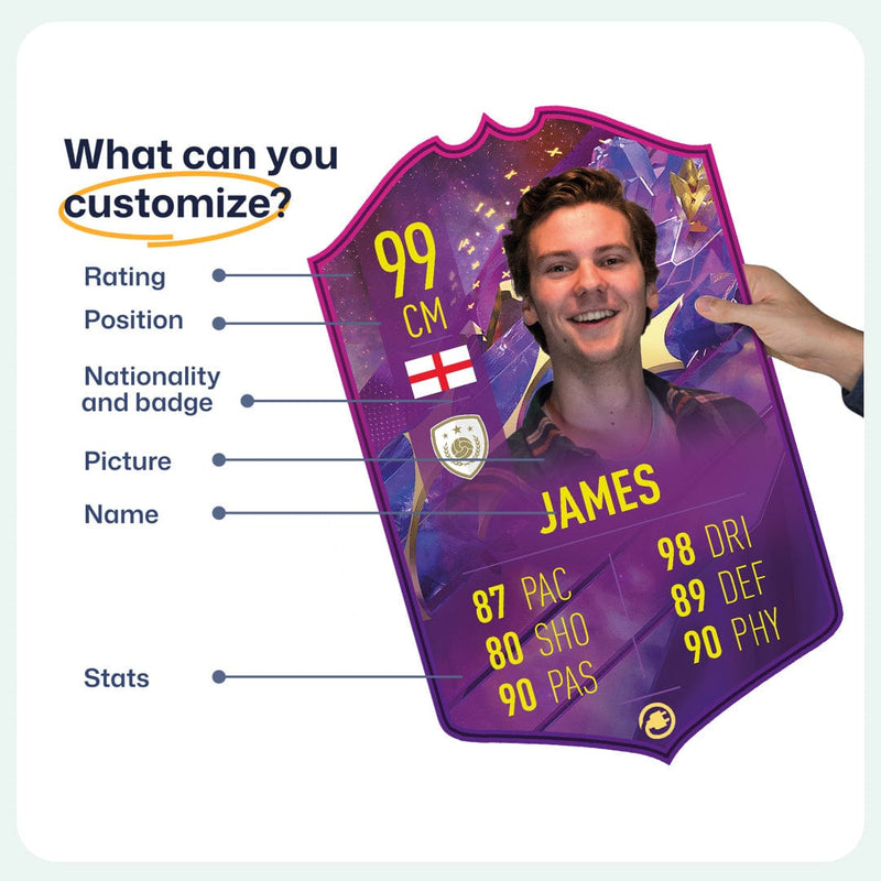 When it comes to personalising your card, the basic steps are to upload a photo and add a name to your card. Then you’ll add details like your player’s position and skill ratings out of 99 for each football skill shown on the card. Our online card builder makes this really easy. And if you aren’t a football card expert, don’t worry!