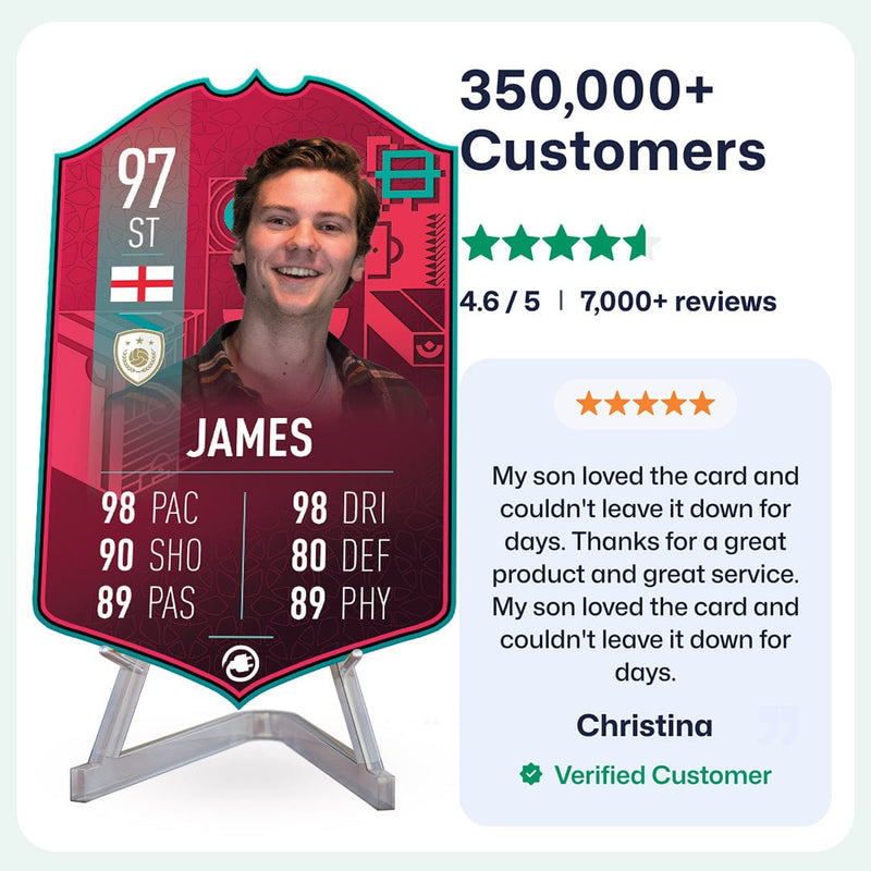 When it comes to personalising your card, the basic steps are to upload a photo and add a name to your card. Then you’ll add details like your player’s position and skill ratings out of 99 for each football skill shown on the card. Our online card builder makes this really easy. And if you aren’t a football card expert, don’t worry!